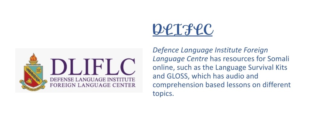 The DLIFLC has made available online their resources for teaching Somali. It’s pretty cool too, with audio and comprehension lessons on different topics and at different levels. If you want to learn some basic phrases, they have Language Survival Kits with audio. I’ve been making use of GLOSS, which has comprehension and listening at different levels to build up my vocab. Check it out here: https://www.dliflc.edu/elearning/